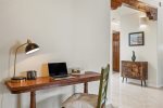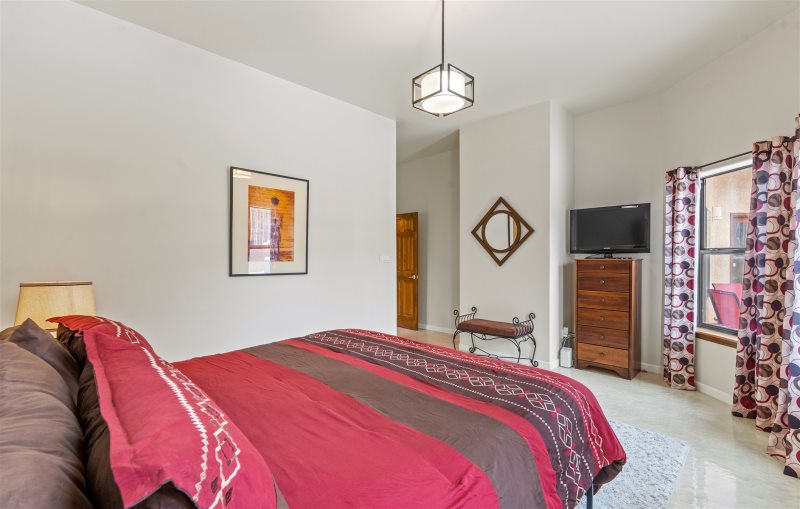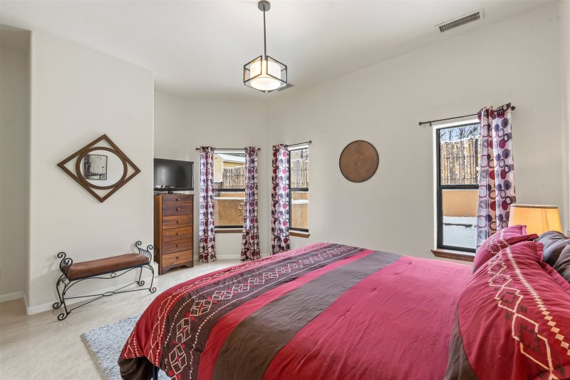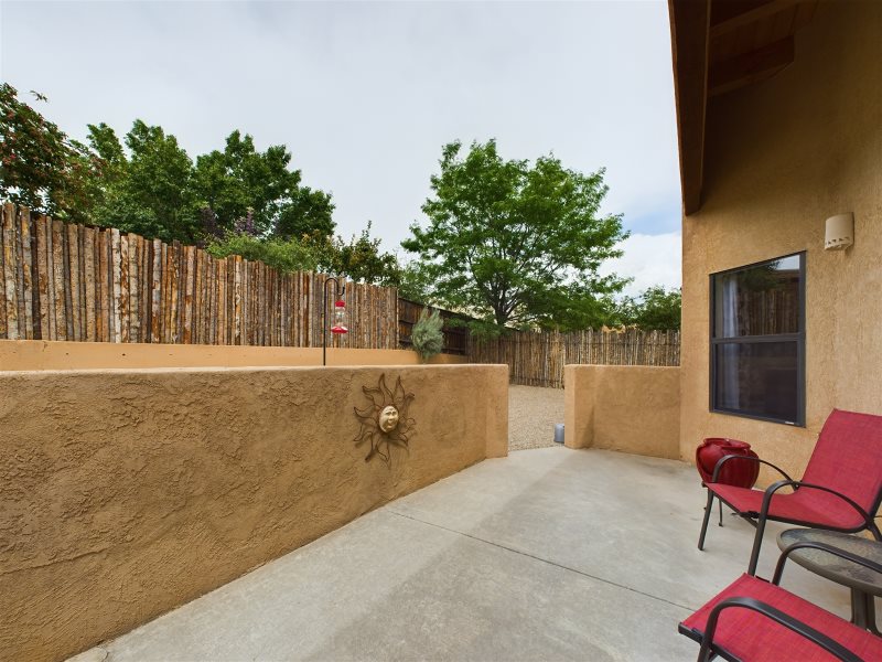 Gated community! Transforming 2 bedroom/2 bath home in highly desirable subdivision of Plaza de Castillo. Elegance greets you upon entry with poxy floors and high ceilings. Sun naturally filters in through clerestory windows. Separate dining area leads to private back patio. Open concept common living area with gas fireplace and bar style seating is great for entertaining! The walk-in master closet with full bath and privacy from sleeping area. The second bedroom completely separated on the opposite side of the home, has natural light filtering. Washer dryer closet conveniently located off hall. Elevated lot is landscaped lending itself to preferred design. One parking spot available in garage. Santa Fe’s amazing trail system is easily accessible right from the house!