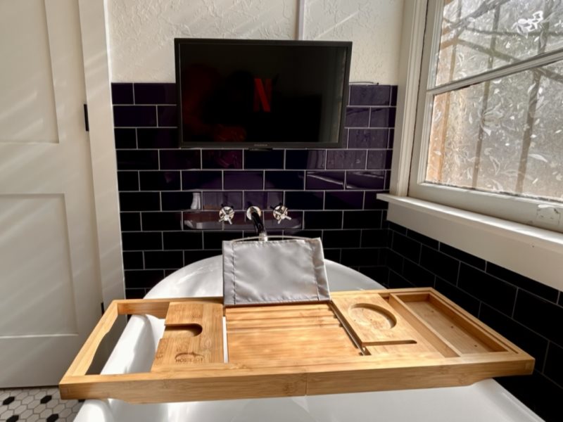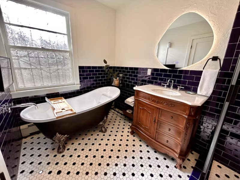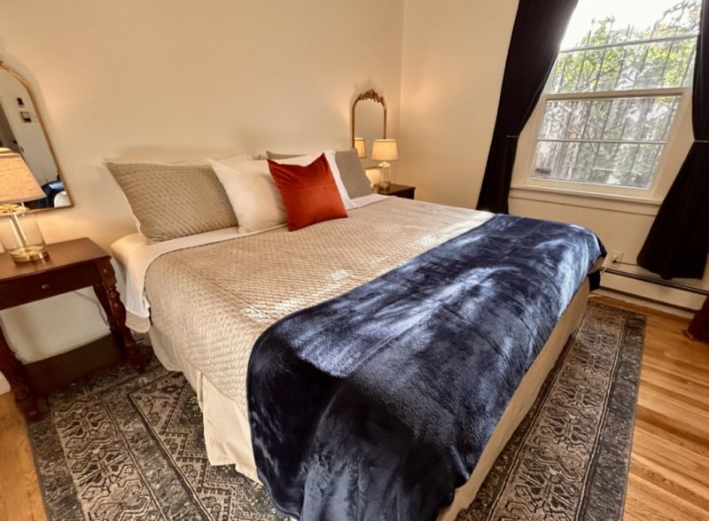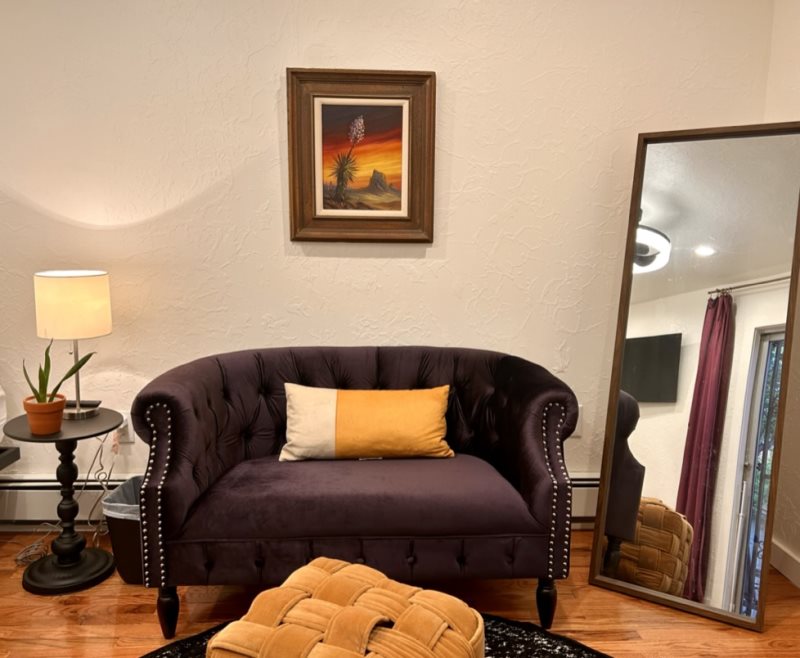 Step inside and discover warm adobe finishes, soft natural light, and thoughtful touches throughout. The living space offers a comfortable place to unwind after a day of galleries or hiking, while the fully equipped kitchen provides everything you need for home-cooked meals or morning coffee before a day out in town.