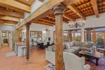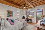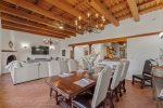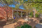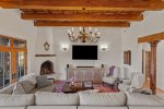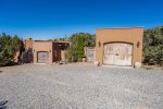 This spacious home features a bright, open living area perfect for gathering, a fully equipped kitchen with everything you need for home-cooked meals, and inviting outdoor spaces ideal for morning coffee or sunset cocktails. Whether you’re unwinding by the kiva fireplace, stargazing from the patio, or exploring nearby hiking trails, you’ll feel immersed in the natural beauty of New Mexico.