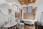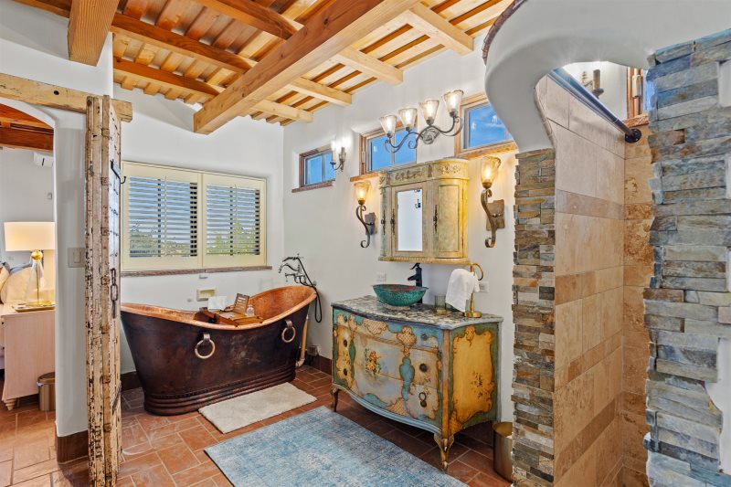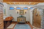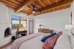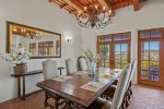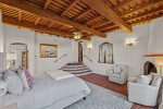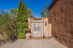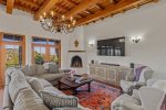 Perched in the tranquil foothills of Santa Fe! Only 10 minutes from the historic Plaza, this beautiful retreat offers sweeping mountain views, refined Southwestern design, and the peaceful privacy travelers crave. Warm plaster walls, traditional vigas, and large picture windows create a serene atmosphere that blends effortlessly with the surrounding landscape.
